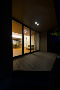 窓を開け放すと、庭からリビングへ心地いい風が吹き抜ける。家の中から眺める庭は、芽吹いた木々が清々しい。室内と屋外の軒がそのまま同じ色合いでつながっているから、デッキや庭までがひとつの大きなリビングのよう。待ち望んだ春の風や美しい新緑を、部屋に招くようにたのしんでいる。