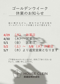 はなぶさ建設も、ゴールデンウイークはお休みをいただきます。12連休??そんなに休むと・・体調を崩してしまいます・・